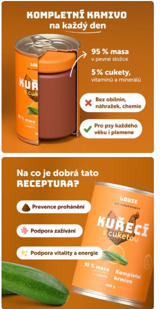 Kompletní krmivo bez obilnin pro psy každého věku i plemene, kuřecí s cuketou. Nabízí Vašemu miláčkovi možnost stravy z kvalitního masa (95 % v pevné složce). Pro podporu peristaltiky střev a simulaci minoritní rostlinné složky v potravě psů slouží příměs cukety. Krmivo neobsahuje žádné konzervanty, dochucovadla, barviva, pouze 95 % masa, 5 % cukety, vitamínů a minerálů.