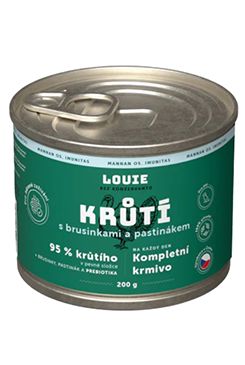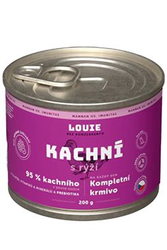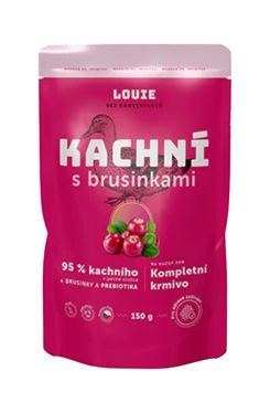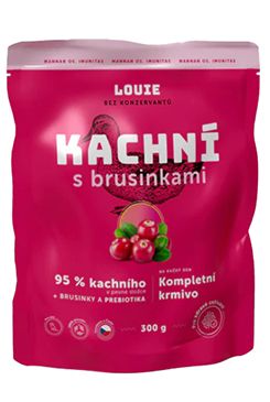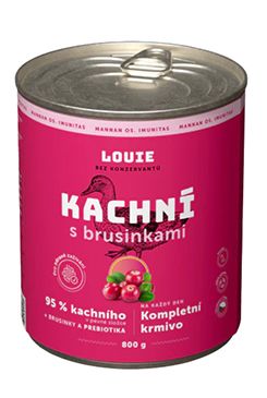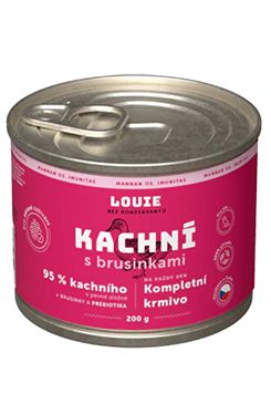 Skladem Louie Dog konz. Kachní s brusinkami a prebiotiky 200g PeMi kód: 741236 EAN: 8595174380048 Kompletní krmivo bez obilnin pro psy každého věku i plemene, kachní s brusinkami. Nabízí Vašemu miláčkovi možnost stravy z kvalitního masa (95 % v pevné složce). Pro podporu peristaltiky střev a simulaci minoritní rostlinné složky v potravě psů slouží příměs brusinek 40 Kč Do košíku