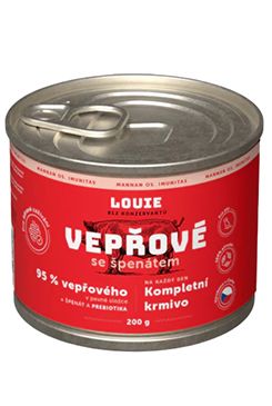 Skladem Louie Dog konz. Vepřové se špenátem a prebiotiky 200g PeMi kód: 741226 EAN: 8595174380680 Kompletní krmivo bez obilnin pro psy každého věku i plemene, vepřové se špenátem. Nabízí Vašemu miláčkovi možnost stravy z kvalitního masa (95 % v pevné složce). Pro podporu peristaltiky střev a simulaci minoritní rostlinné složky v potravě psů slouží příměs špenátu a prebiotik 40 Kč Do košíku