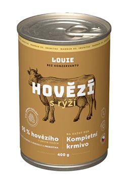 Skladem Louie Dog konz. Hovězí s rýží a prebiotiky 400g PeMi kód: 741249 EAN: 8595174346518 Kompletní krmivo bez obilnin pro psy každého věku i plemene, hovězí s rýží. Nabízí Vašemu miláčkovi možnost stravy z kvalitního masa (95 % v pevné složce). Pro podporu peristaltiky střev a simulaci minoritní rostlinné složky v potravě psů slouží příměs rýže 71 Kč Do košíku