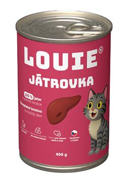 Skladem Louie Cat konz. Játrovka s prebiotiky 400g PeMi kód: 741263 EAN: 8595174380642 Kompletní krmivo bez obilnin pro kočky každého věku i plemene, 100 % játra. Nabízí Vašemu miláčkovi možnost stravy z kvalitních jater (100 % v pevné složce) s prebiotiky pro podporu peristaltiky střev. Krmivo neobsahuje žádné konzervanty, barviva, pouze 100 % jater, prebiotika, vitamíny a 76 Kč Do košíku