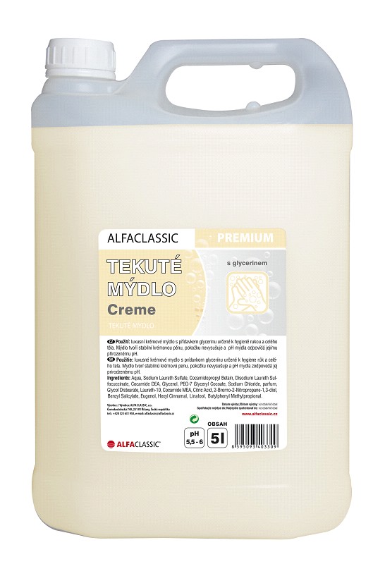 Skladem Tekuté mýdlo creme premium 5l PeMi kód: 726752 EAN: 8595093403309 Luxusní krémové mýdlo s přídavkem glycerinu a jemnou vůní, určené k hygieně rukou a celého těla. Mýdlo tvoří stabilní krémovou pěnu, pokožku nevysušuje a pH mýdla odpovídá jejímu přirozenému pH. 472 Kč Do košíku