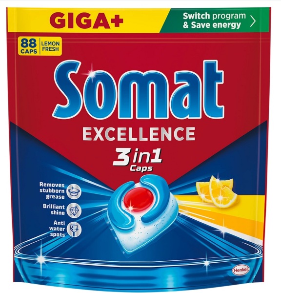 Skladem 3 ks. Somat tablety do myčky Excellence 4v1 30 ks PeMi kód: 736275 EAN: 9000101808292 Somat Excellence 4v1 kapsle na mytí nádobí obsahují prémiový multifunkční prostředek na mytí nádobí vyrobený z prášku v kombinaci se 3 jedinečnými pevnými gelovými komorami v biologicky odbouratelné fólii rozpustné ve vodě 199 Kč Do košíku