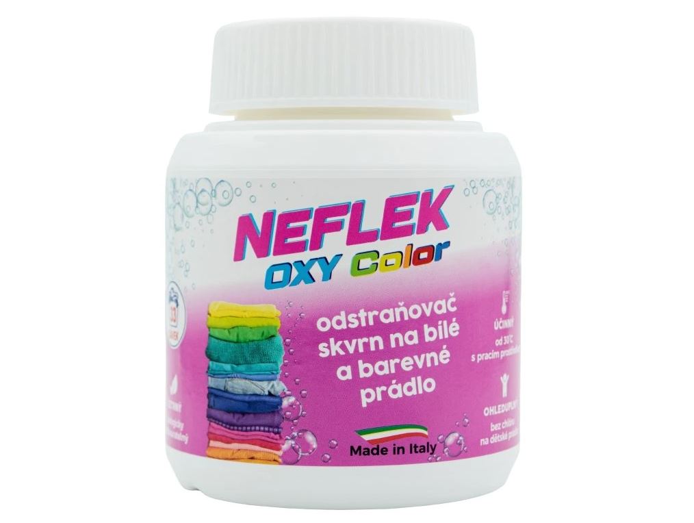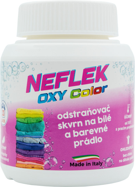 Skladem NEFLEK OXY COLOR odstraňovač skvrn 500 g PeMi kód: 714768 EAN: 8056646092338 NEFLEK OXY COLOR je účinný sypký odstraňovač skvrn, který spolehlivě odstraňuje i ty nejodolnější nečistoty z barevného prádla . Díky aktivnímu složení bez chlóru účinně působí na skvrny od vína, kávy, čokolády, ovoce, trávy, inkoustu, make-upu, krve či mastnoty, aniž by poškodil barvy 99 Kč Do košíku