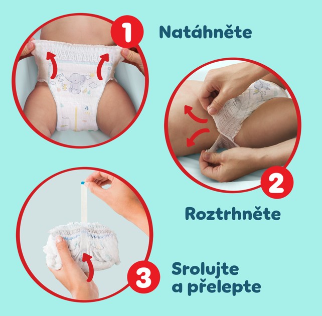 Plenkové kalhotky Pampers Premium Care Pants se stejně jako všechny plenkové kalhotky od Pampers snadno vyměňují: obléknete je jedním tahem a svléknete roztržením na bocích, i když je děťátko neposedné. Pak je stačí srolovat a zajistit páskem pro snadnou likvidaci.