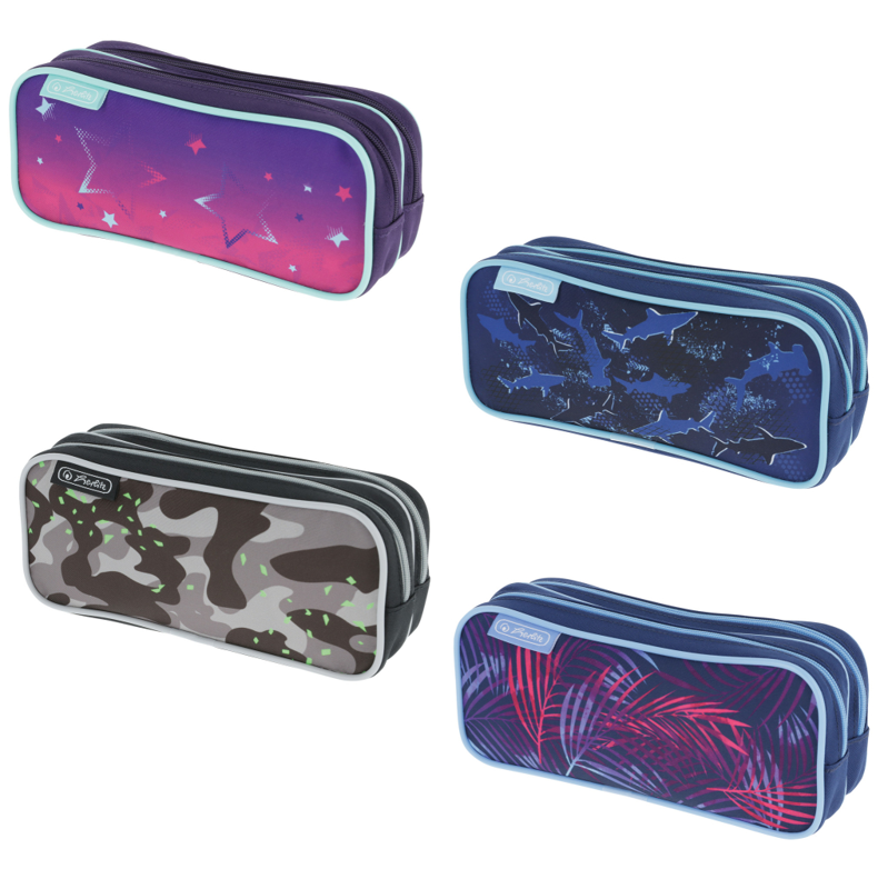 Skladem Penál etue dvojitý Herlitz mix PeMi kód: 718801 EAN: 4008110372969 Dvojité pouzdro na tužky se dvěma kapsami na zip, 21 x 6,5 x 9 cm, prázdné, mix barev, holky+kluci, Tropic, Hvězdy, žraloci, maskačové šedé. 166 Kč Do košíku