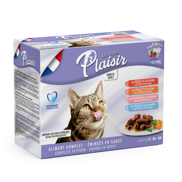 Skladem Plaisir cat Kapsa Multipack pro dospělé i kastrované kočky 4x85g (2xhovězí, 2xkuřecí) PeMi kód: 724886 EAN: 3428460082508 Složení hovězí s krůtím masem: maso a vedlejší produkty živočišného původu (včetně hovězího 4%, krůtího 4%), rostlinné produkty, rostlinné bílkovinné extrakty, minerály, různé cukry. <st 48 Kč Do košíku