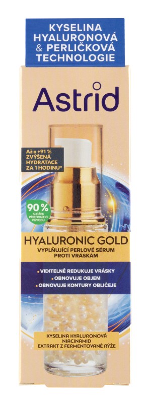 Skladem Astrid perl sérum 30ml Hyaluronic Gold PeMi kód: 716173 EAN: 8592297012047 Inovativní sérum s 90 % přírodních složek , které díky unikátní „perličkové technologii“ efektivně vyplňuje vrásky, obnovuje kontury obličeje a sjednocuje pigmentaci – a to již během týdne. Klíčové složky & účinky Kyselina hyaluronová – hyaluronové perly se při 311 Kč Do košíku