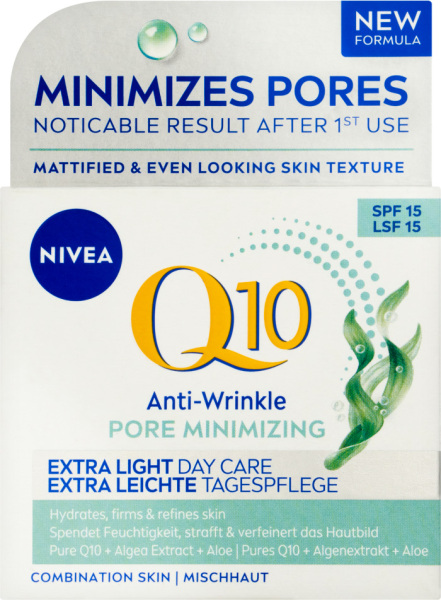 Skladem NIVEA Denní Krém Q10 Pore Minimizing 50 ml PeMi kód: 712606 EAN: 9005800379715 Řekněte sbohem viditelným pórům a přivítejte hladší a sjednocenou pleť! NIVEA Q10 Pore Minimizing kombinuje sílu koenzymu Q10 a mořských řas , aby zmatnil pleť, zmenšil viditelnost pórů a zároveň poskytl hloubkovou hydrataci 615 Kč Do košíku