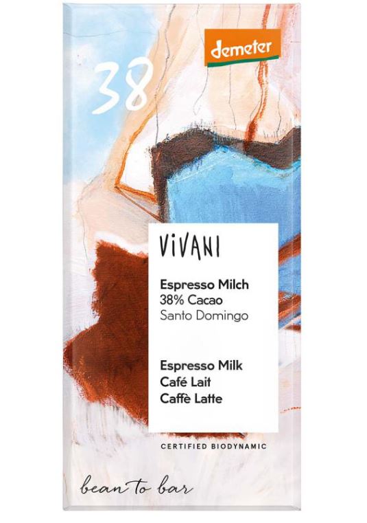 Dodání do 3 pracovních dnů Čokoláda mléčná Espresso Milk 38 % 90 g BIO VIVANI PeMi kód: 721024 EAN: 4044889005141 Řepný cukr*, kakaové máslo*, sušené odstředěné MLÉKO* 15 %, kakaová hmota*, PODMÁSLÍ* 5,3 %, espresso prášek* 2 %, bourbon vanilka*.Může obsahovat stopy skořápkových plodů a lepku. *produkt kontrolovaného ekologického zemědělství<p><strong>Kalorická hodnota/energie (na 95 Kč Do košíku