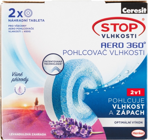 Skladem Ceresit Stop Vlhkosti Aero 360° Náhradní tablety – Levandule 2 × 450 g (900 g) PeMi kód: 717279 EAN: 9000100937818 Ceresit Stop Vlhkosti Aero 360° modrý pohlcovač vlhkosti + 2 náhradní tablety 450 g. Kompletní sada pro regulaci vlhkosti v domácnosti obsahuje: 1× přístroj Aero 360° s aerodynamickým designem pro 360° cirkulaci vzduchu 325 Kč Do košíku
