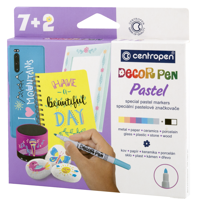 Skladem Popisovače Centropen Decor Pen pastel 7+2ks PeMi kód: 679926 EAN: 8595013646540 Nové pastelové popisovače. Popisují kov, dřevo, plast, Fimo hmotu, sklo, keramiku atd. Speciální barevné značkovače na povrchy všech běžných materiálů, ERGO držení, pigmentový inkoust na vodní bázi, světlostálý po dokonalém zaschnutí (min. 4 hod 155 Kč Do košíku