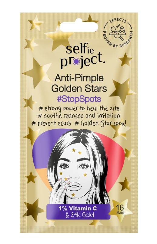 • Zlaté hvězdičky Selfie Project #Hello Winter Anti-Pimple jsou to malé masky proti pupínkům, které lze přilepit přesně na černé tečky. Díky kombinaci 1 % kyseliny salicylové, 2 % oleje z hvězdníku a hydrokoloidní technologii náplasti nejen chrání podrážděnou pleť, ale mají také zklidňující