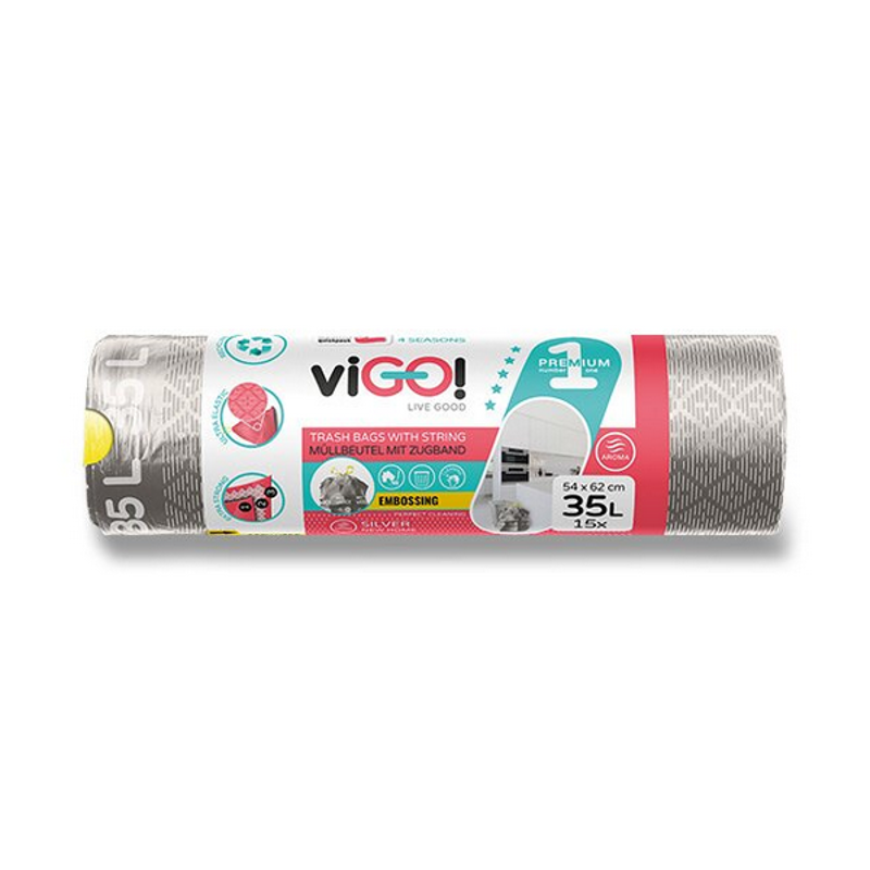 Skladem Zatahovací pytle na odpadky VIGO 35l 15ks PeMi kód: 681845 EAN: 5902841474482 Stříbrné pytle na odpad o objemu 35 litrů a velikosti balení 15 kusů. Každý kus má rozměr 54 × 62 cm. Pytle jsou zatahovací a neparfémované . Vlastnosti viGO pytle na odpad: 100% recyklovaný ekologický obal s certifikací FSC a Blue Angel vyrobeno z odolné 59 Kč Do košíku