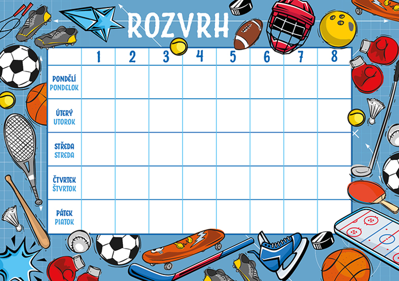 Skladem Rozvrh hodin A5 Sport PeMi kód: 722006 EAN: 8595179256164 Perfektní rozvrh hodin. Už nikdy nezapomenete, kdy máte matiku! 6 Kč Do košíku
