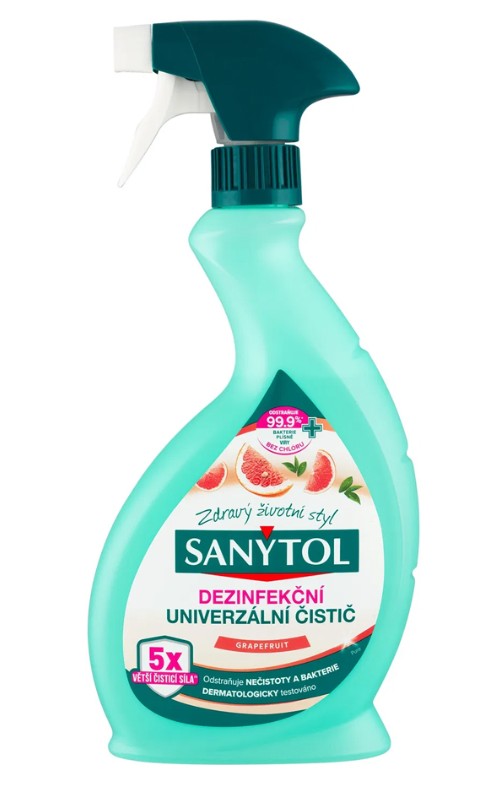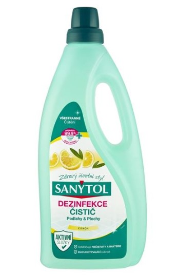 • Sanytol čistič na podlahy a plochy díky trojímu účinku - bakteriálnímu, fungicidnímu a virucidnímu - dezinfikuje všechny materiály a plochy a ničí mikroby . Čistí, dezinfikuje a odmašťuje všechny plochy v domácnosti. Neobsahuje chlór a nezpůsobuje skvrny. Biologicky odbouratelný