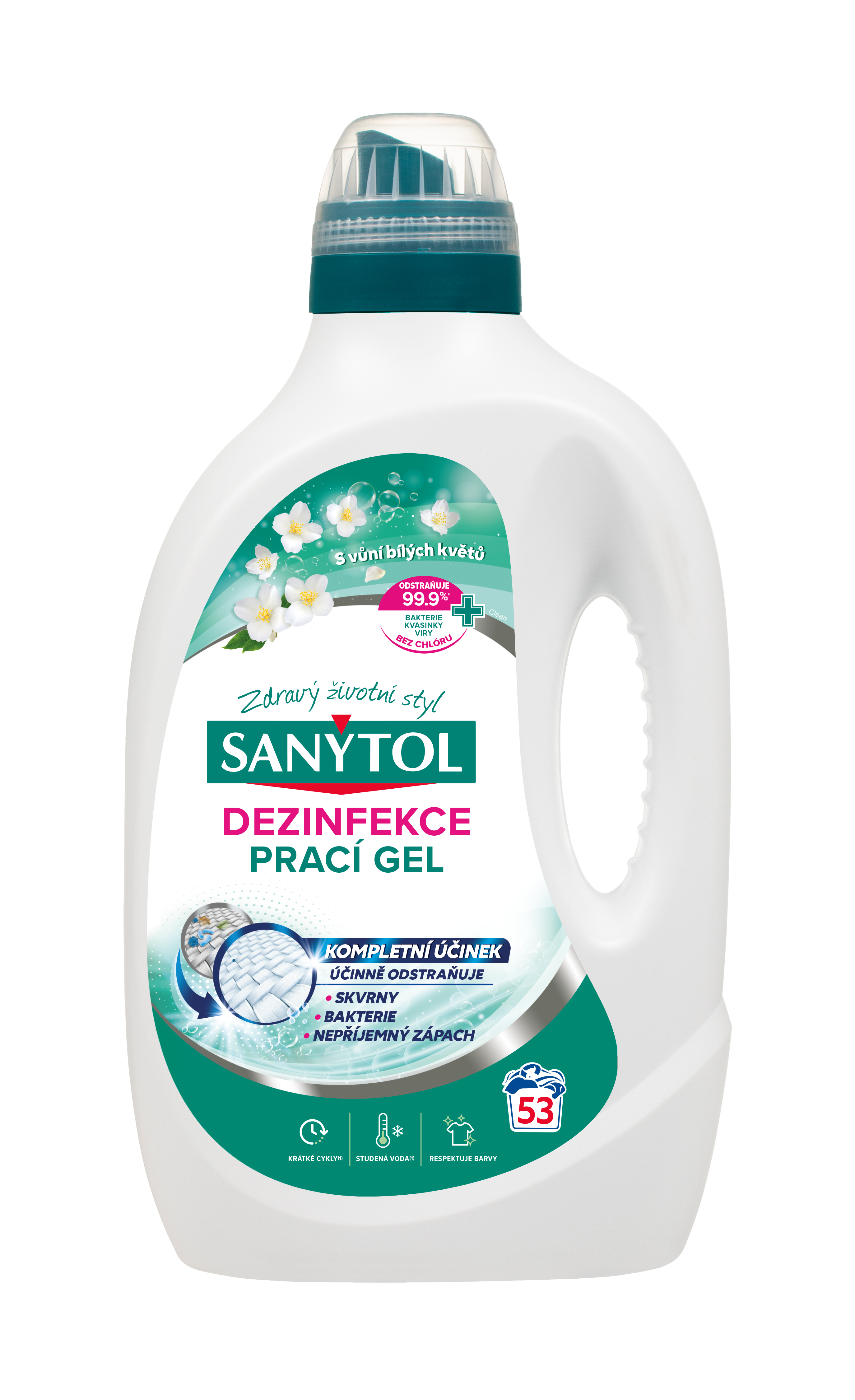 • Objevte sílu Sanytol Dezinfekčního pracího gelu Bílé květy 2,65 l , který odstraňuje 99,9 % bakterií, virů a plísní i při nízkých teplotách od 20 °C. Tento hypoalergenní prací gel je vhodný pro bílé i barevné prádlo a díky příjemné květinové vůni zanechá vaše prádlo nejen hygienicky čisté,