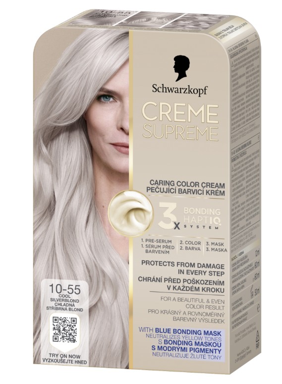 Skladem Creme Supreme 10-55 Chladná stříb blond PeMi kód: 728312 EAN: 9000101747621 Schwarzkopf Creme Supreme 10-55 – Chladná stříbrná blond je krémová barva na vlasy, která poskytuje moderní, elegantní studený blond odstín se stříbrnými reflexy. Díky jemné krémové konzistenci se barva snadno nanáší a rovnoměrně pokrývá vlasy, zajišťuje intenzivní a dlouhotrvající 214 Kč Do košíku