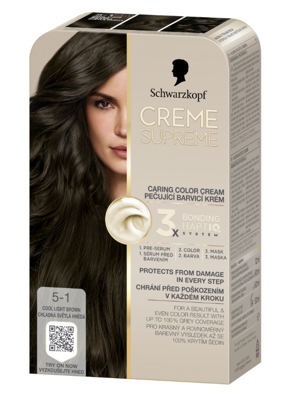 Skladem Creme Supreme 5-1 Chladná světlá hnědá PeMi kód: 728317 EAN: 9000101744781 Schwarzkopf Creme Supreme 5-1 Chladná světlá hnědá je permanentní barva na vlasy, která nabízí přirozený studený tón s jemným nádechem elegance. Díky inovativní technologii Bonding HaptIQ poskytuje intenzivní ochranu a péči v každé fázi barvení – od přípravy přes samotné barvení až po 214 Kč Do košíku