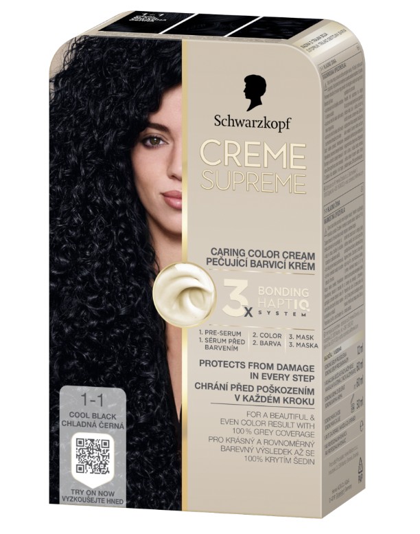 Skladem Creme Supreme 1-1 Chladná černá PeMi kód: 728320 EAN: 9000101747829 Schwarzkopf Creme Supreme 1-1 – Chladná černá je krémová barva na vlasy, která poskytuje intenzivní a hluboký černý odstín s jemně chladným tónem. Krémová konzistence umožňuje snadné a rovnoměrné nanášení a zajišťuje perfektní krytí od kořínků po konečky 214 Kč Do košíku