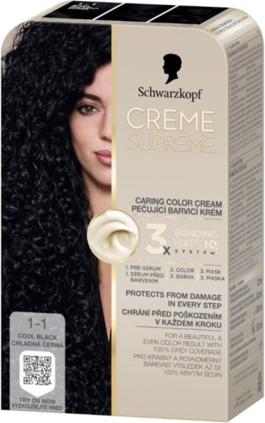 Skladem Schwarzkopf Creme Supreme barva na vlasy 1-1 chladná černá 60 ml PeMi kód: 735793 EAN: 9000101747829 Schwarzkopf Creme Supreme 1-1 – Chladná černá je krémová barva na vlasy, která poskytuje intenzivní a hluboký černý odstín s jemně chladným tónem. Krémová konzistence umožňuje snadné a rovnoměrné nanášení a zajišťuje perfektní krytí od kořínků po konečky 234 Kč Do košíku