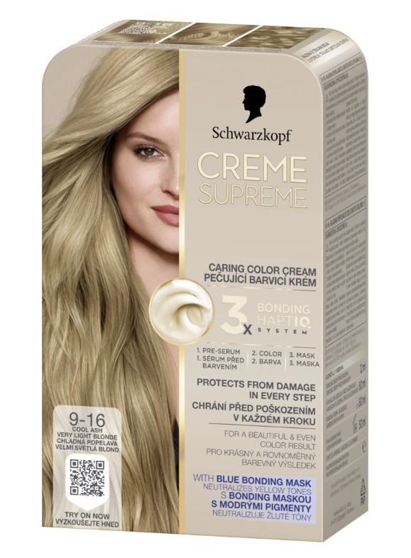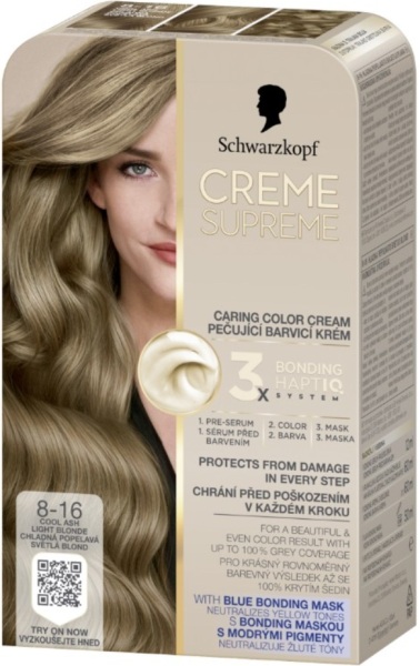 Skladem Schwarzkopf Creme Supreme barva na vlasy 8-16 chladná popelavá světlá blond 60 ml PeMi kód: 735778 EAN: 9000101745580 Permanentní barva na vlasy Schwarzkopf Creme Supreme 8-16 poskytuje svěží, elegantní velmi světlý blond odstín s chladným popelavým tónem. Barva je navržena tak, aby dodala vlasům rovnoměrný a profesionální výsledek, zároveň je chránila a vyživovala díky technologii Bonding HaptIQ, 234 Kč Do košíku
