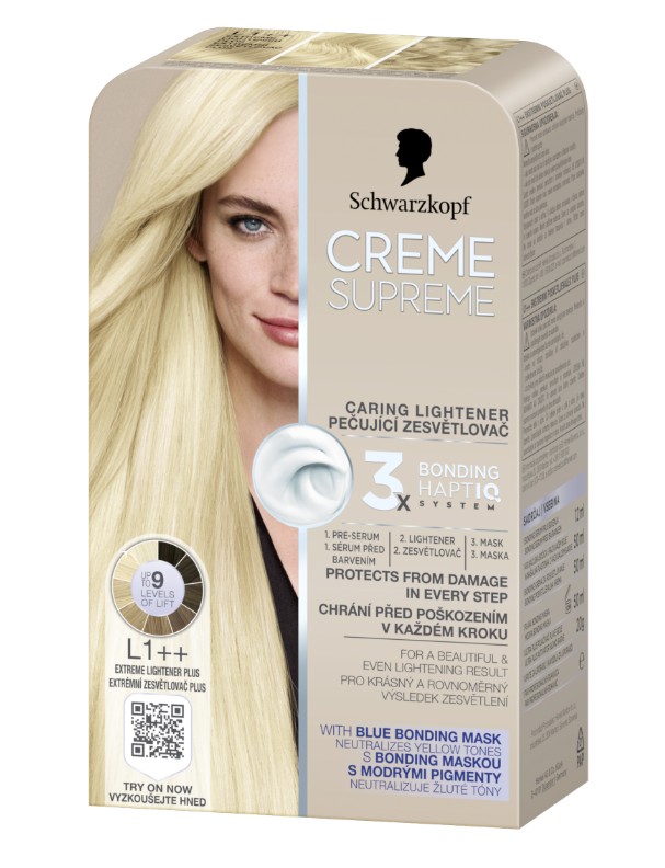 Skladem Creme Supreme L1++ Extrém zesvětl plus PeMi kód: 728321 EAN: 9000101746327 Schwarzkopf Creme Supreme L1++ Extrémní zesvětlovač Plus je profesionální zesvětlující barva na vlasy určená pro dosažení až o 9 odstínů světlejšího tónu. Inovativní technologie Bonding HaptIQ chrání a posiluje vlasová vlákna během zesvětlování, čímž zajišťuje zdravý vzhled a hebkost 214 Kč Do košíku