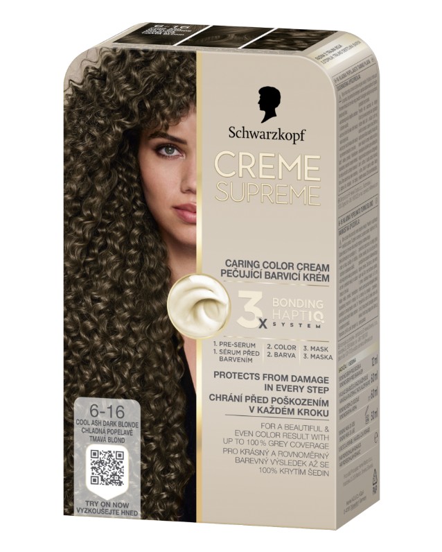 Skladem Schwarzkopf Creme Supreme barva na vlasy 6-16 chladná popelavá tmavá blond 60 ml PeMi kód: 735781 EAN: 9000101745801 Permanentní barva na vlasy Schwarzkopf Creme Supreme 6-16 nabízí elegantní tmavý blond odstín s chladným popelavým podtónem. Díky technologii Bonding HaptIQ poskytuje intenzivní ochranu a péči během barvení, čímž zajišťuje krásný a rovnoměrný barevný výsledek s až 100% krytím šedin 234 Kč Do košíku