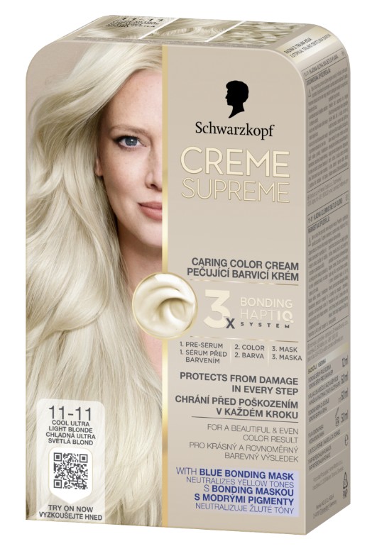 Skladem Schwarzkopf Creme Supreme barva na vlasy 11-11 chladná ultra světle blond 60 ml PeMi kód: 735779 EAN: 9000101745429 Permanentní barva na vlasy Schwarzkopf Creme Supreme 11-11 nabízí velmi světlý, chladný odstín s jemným popelavým nádechem. Díky technologii Bonding HaptIQ poskytuje intenzivní ochranu a péči během barvení, čímž zajišťuje krásný a rovnoměrný barevný výsledek s až 100% krytím šedin 234 Kč Do košíku