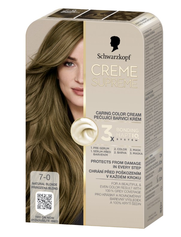 Skladem Schwarzkopf Creme Supreme barva na vlasy 7-0 přirozená blond 60 ml PeMi kód: 735780 EAN: 9000101745702 Permanentní barva na vlasy Schwarzkopf Creme Supreme 7-0 nabízí přirozený, teplý odstín středně světlé blond. Díky inovativní technologii Bonding HaptIQ poskytuje intenzivní ochranu a péči během barvení, čímž zajišťuje krásný a rovnoměrný barevný výsledek s až 100% krytím šedin 234 Kč Do košíku
