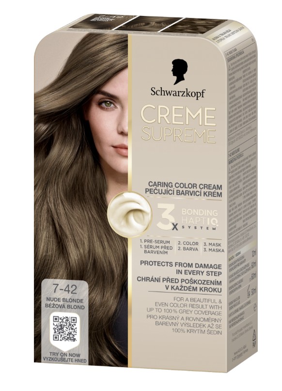 Skladem Schwarzkopf Creme Supreme barva na vlasy 7-42 béžová blond 60 ml PeMi kód: 735789 EAN: 9000101747140 Schwarzkopf Creme Supreme 7-42 – Béžová blond je krémová barva na vlasy, která poskytuje přirozený a jemně teplý blond odstín s dlouhotrvajícím efektem. Krémová textura umožňuje snadné a rovnoměrné nanášení, dokonalé krytí a ochranu vlasů během barvení 234 Kč Do košíku