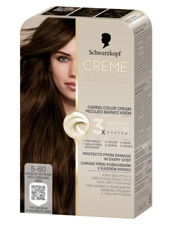 Skladem Creme Supreme 5-60 Sv čokoládová hnědá PeMi kód: 728400 EAN: 9000101746105 Schwarzkopf Creme Supreme 5-60 Světlá čokoládová hnědá je luxusní krémová barva na vlasy, která nabízí intenzivní, dlouhotrvající odstín s přirozeným čokoládovým tónem. Díky své bohaté, pečující receptuře s vyživujícími oleji a mikro-pigmenty poskytuje dokonalé krytí šedin, vysoký lesk a 214 Kč Do košíku