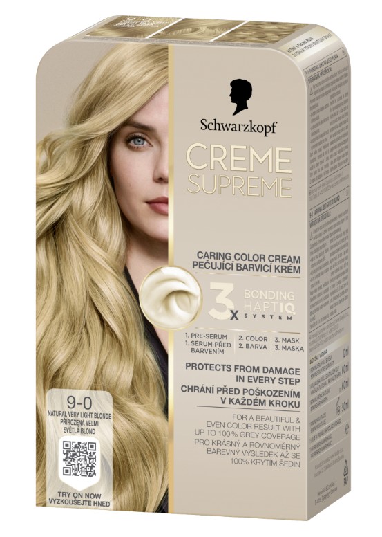 Skladem Schwarzkopf Creme Supreme barva na vlasy 9-0 přirozená velmi světlá blond 60 ml PeMi kód: 735790 EAN: 9000101747201 Schwarzkopf Creme Supreme 9-0 – Přirozená velmi světlá blond je krémová barva na vlasy, která poskytuje jasný a přirozený světlý blond odstín s dlouhotrvajícím efektem. Díky krémové konzistenci se barva snadno nanáší a rovnoměrně pokrývá vlasy, čímž zajišťuje intenzivní a rovnoměrný 234 Kč Do košíku