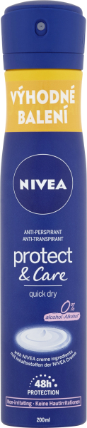 Skladem Nivea Protect & Care antiperspirant, 200 ml PeMi kód: 710231 EAN: 5900017076904 Šetrné složení s pečujícími ingrediencemi originálního krému NIVEA poskytuje spolehlivou ochranu proti pocení až po 48 hodin a zároveň mimořádně pečuje o jemnou pokožku podpaží. 110 Kč Do košíku