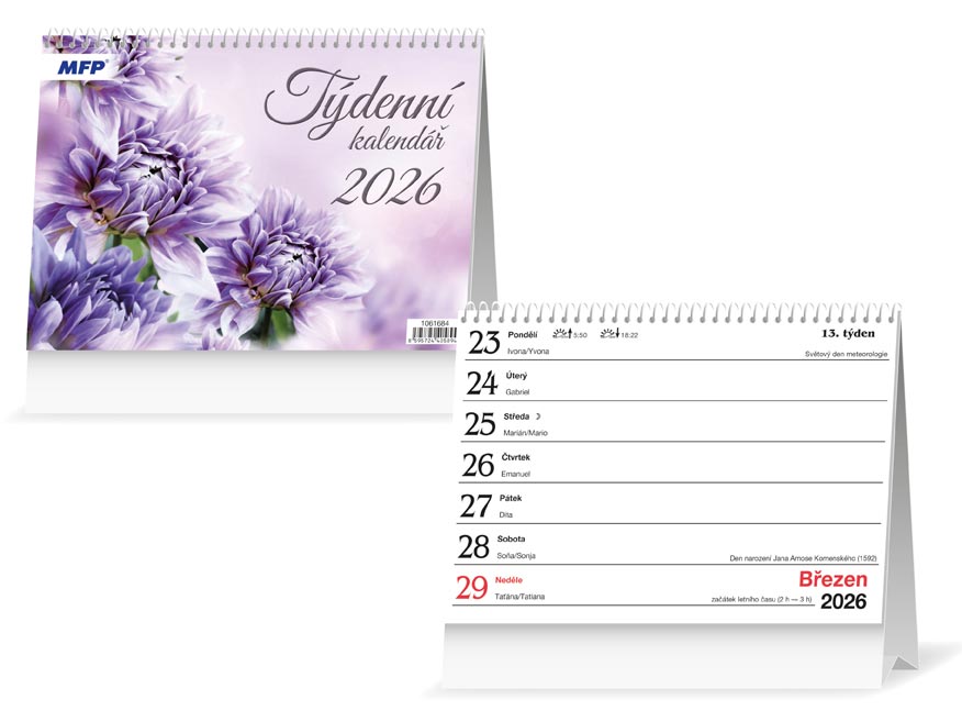 • Týdenní stolní kalendář s českým sloupcovým rozšířeným jmenným kalendáriem má rozsah 31 listů, bílou kroužkovou vazbu a stojánek se zámkem. Obálka má lesklý křídový papír 130 g, listy ofsetový bezdřevý papír 80 g