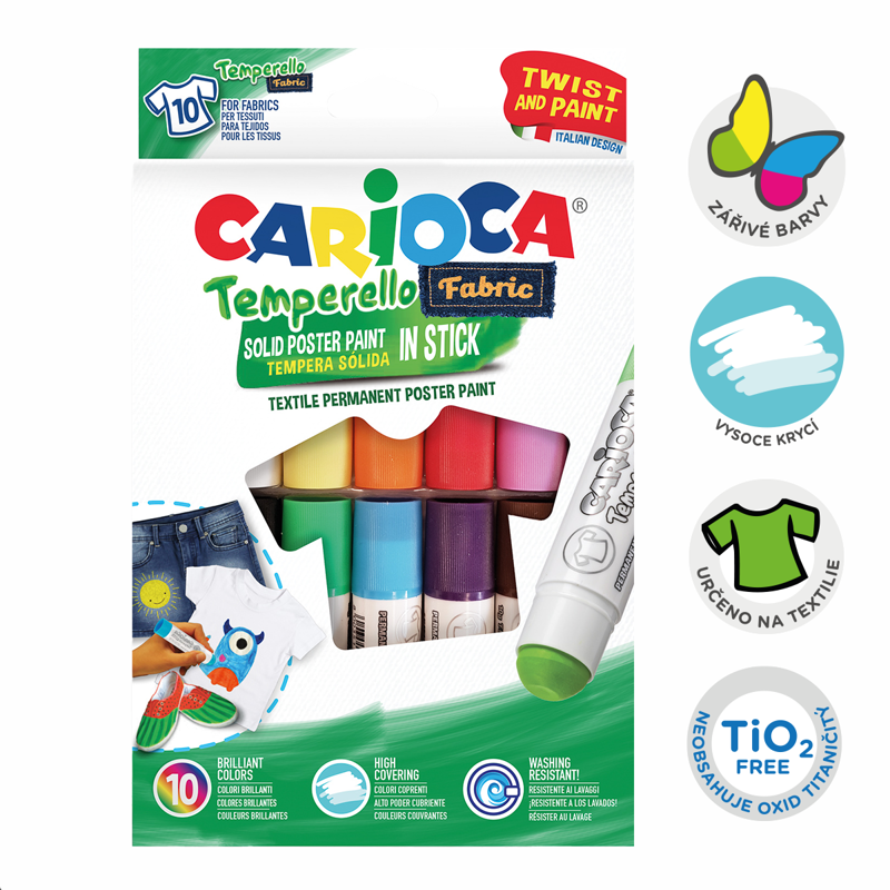 Skladem Temperové barvy tuhé na textil Carioca 10ks PeMi kód: 721147 EAN: 8003511423247 Vytvořte si jedinečné módní kousky s temperovými barvami na textil od italské značky Carioca. Praktické balení v tyčince pro nanášení barev. Skvělá zábava pro všechny bez ohledu na věk! Temperové barvy na textil, které stačí nanést, zažehlit a můžete oblékat svoje nápady 285 Kč Do košíku