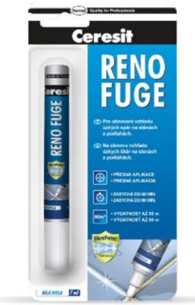 Skladem CERESIT RENO FUGE, 7ML PeMi kód: 721176 EAN: 9000100789288 CERESIT RENO FUGE je praktický a přesný pomocník pro rychlou obnovu vzhledu starých, zašlých nebo vybledlých spár mezi keramickými obklady a dlaždicemi . Ať už se jedná o koupelnu, kuchyň nebo podlahu, tento obnovovač spár navrací povrchu čistý, svěží a upravený vzhled – bez 168 Kč Do košíku