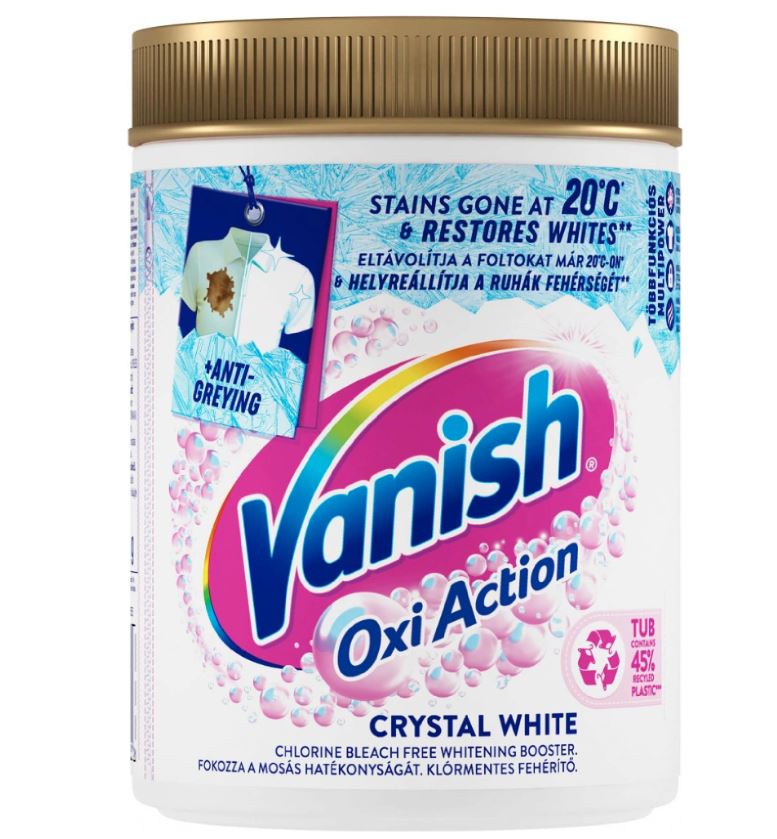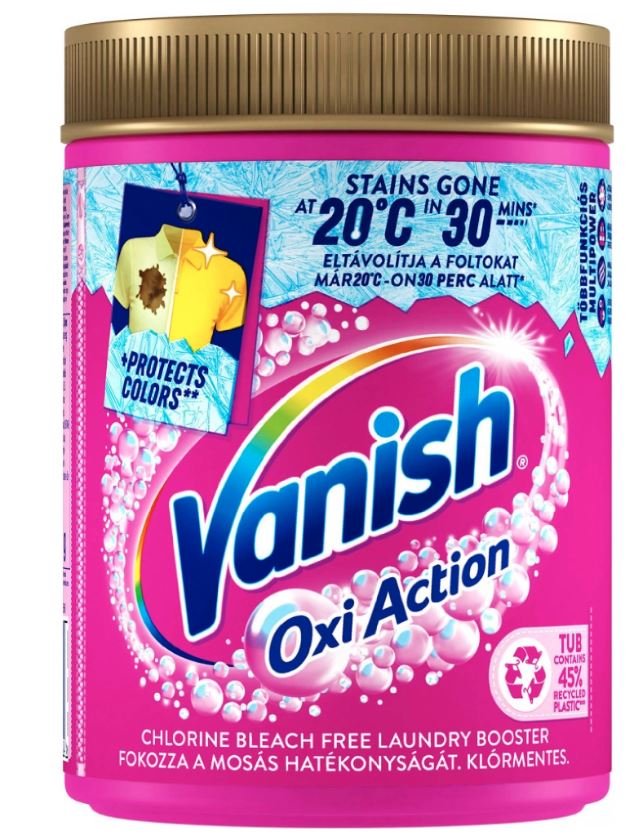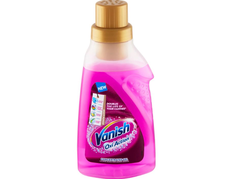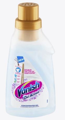 • Vanish Oxi Action Gel na bělení a odstranění skvrn je inovativní produkt, který odstraňuje skvrny již při 20 °C a krátkém cyklu. Tento gel obnovuje bělost prádla a brání jeho zašednutí, minimalizuje zápach a zajišťuje hygienickou čistotu