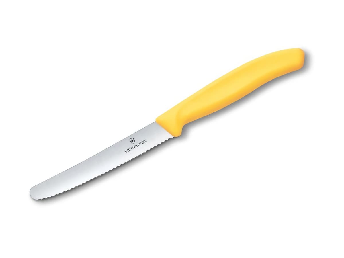 • Nůž na rajčata a zeleninu s vroubkovaným ostřím, 11 cm, žlutý - Praktický kuchyňský nůž určený ke krájení rajčat, ovoce a další měkké zeleniny se slupkou. Vroubkovaná čepel z nerezové oceli (délka 11 cm) si hravě poradí i s měkkými surovinami bez jejich mačkání