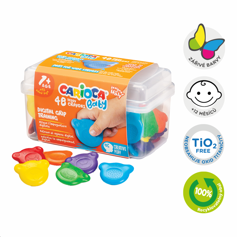 Skladem Voskovky Carioca Baby Teddy 1+ 12ks PeMi kód: 721154 EAN: 8003511439576 Rozvíjejte kreativitu, fantazii a šikovné ručičky těch nejmenších. Sortiment Carioca Baby je určený pro děti od 12 do 36 měsíců, je nejen bezpečný a nezávadný, ale také plný barev a radosti z objevování. Vytvořeno s láskou k dětskému tvoření pro malé umělce, kteří si rádi hrají a rostou s každým 185 Kč Do košíku