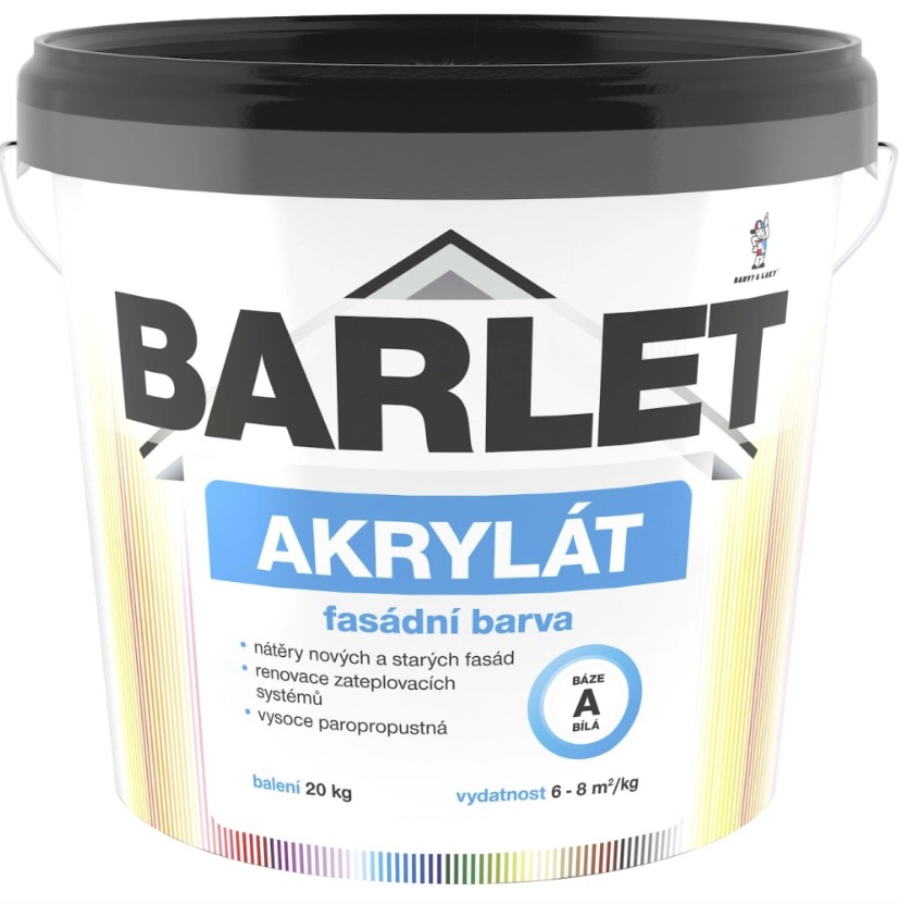 • BARLET akrylát Plus báze A je moderní akrylátová fasádní barva určená k tónování na našich prodejnách, bílá báze A se používá jako bílá fasádní barva. Při nízké spotřebě výborně kryje, překrývá mikrotrhlinky a je velmi vhodný pro renovaci zateplovacích systémů